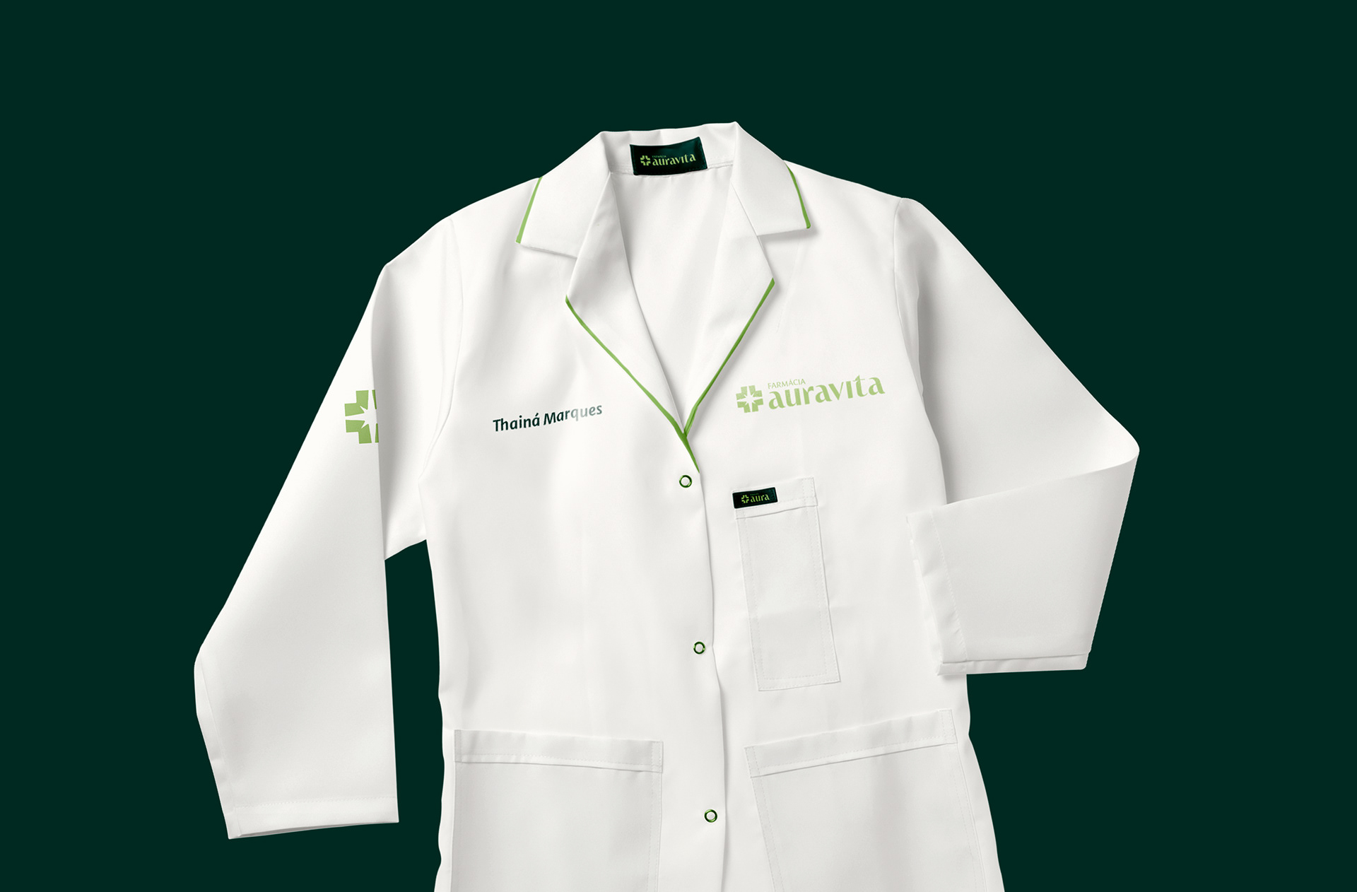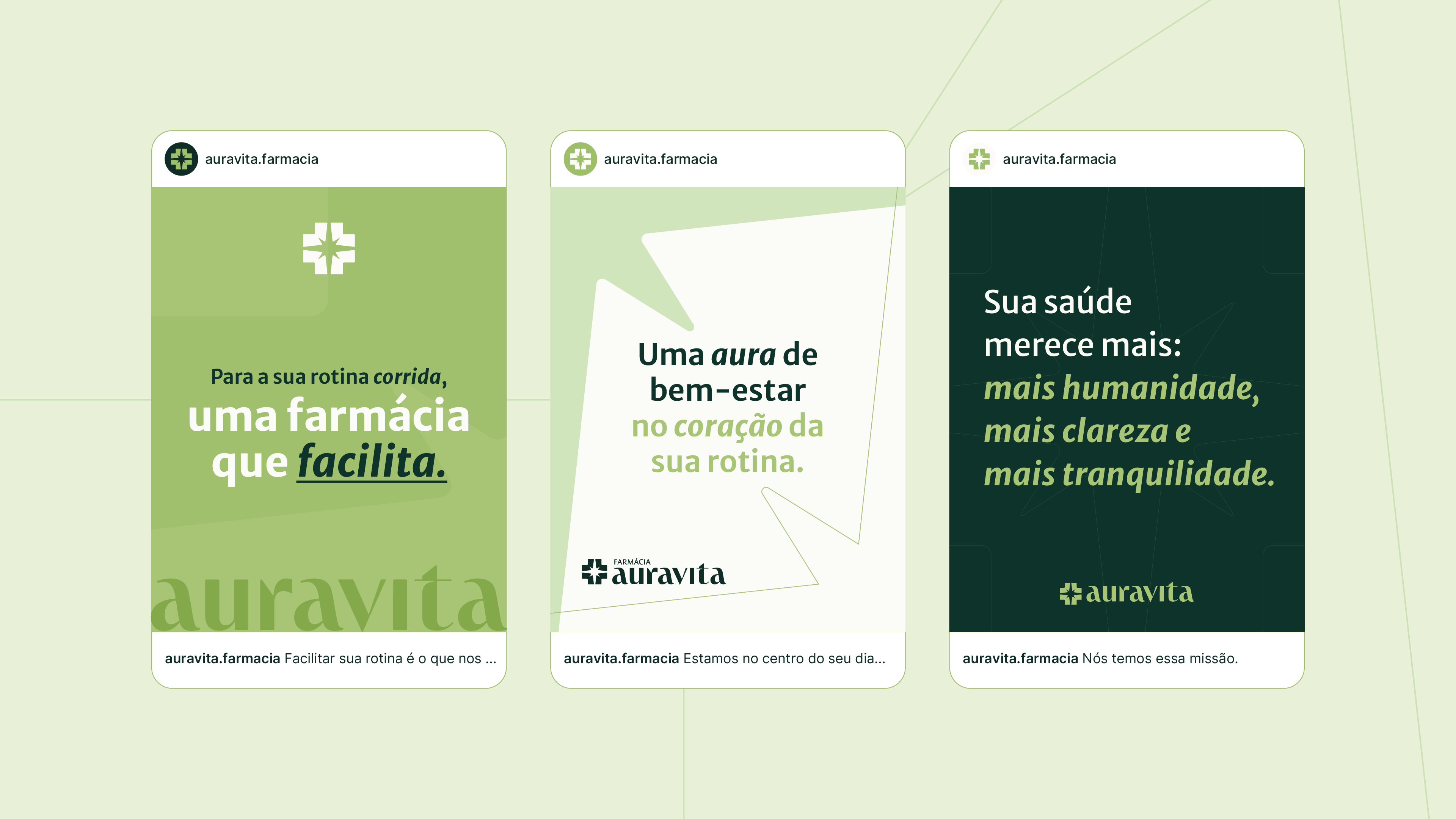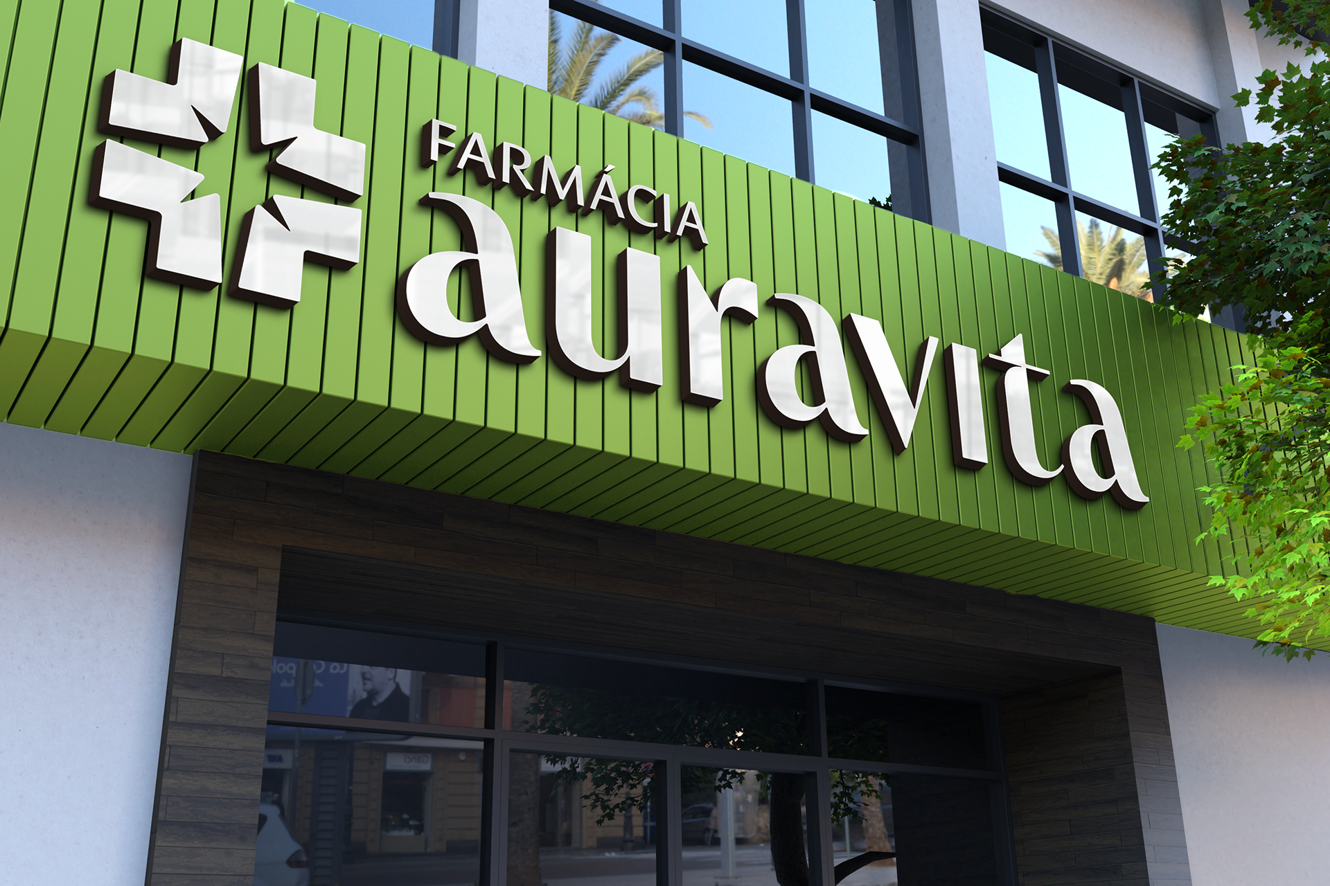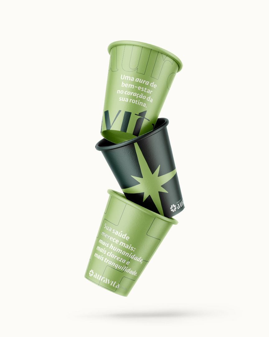 Essa estratégia fundamenta o naming Auravita: uma solução que equilibra a atmosfera de bem-estar (Aura) ao compromisso com a saúde (Vita), superando a complexidade de registro na Classe 35 do INPI. O sistema visual rompe com o padrão popular ao adotar o Verde Aura, evocando serenidade e sofisticação. O logotipo funde a cruz farmacêutica a uma estrela de oito pontas, simbolizando o acompanhamento ativo e a localização geográfica da marca (encontro central de ruas). Complementado pela tipografia com raiz mais humanista, o design estabelece uma ponte entre o rigor técnico do especialista e a proximidade necessária ao cuidado familiar.
